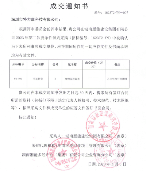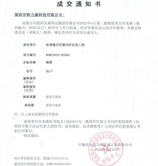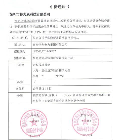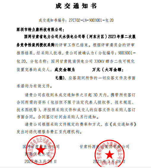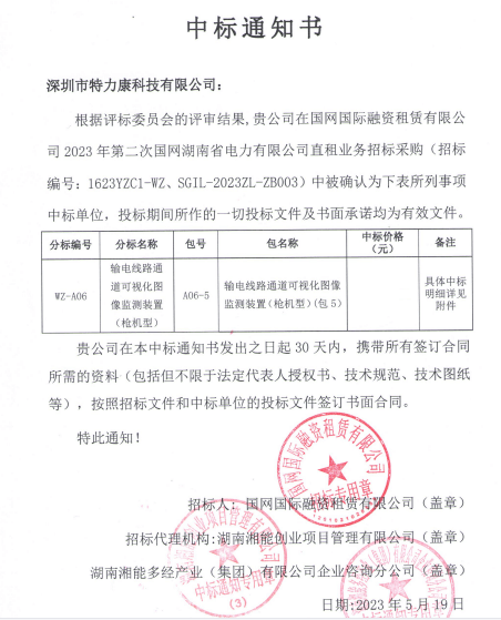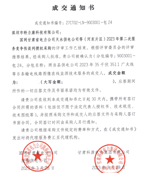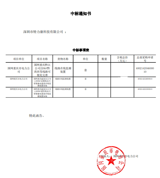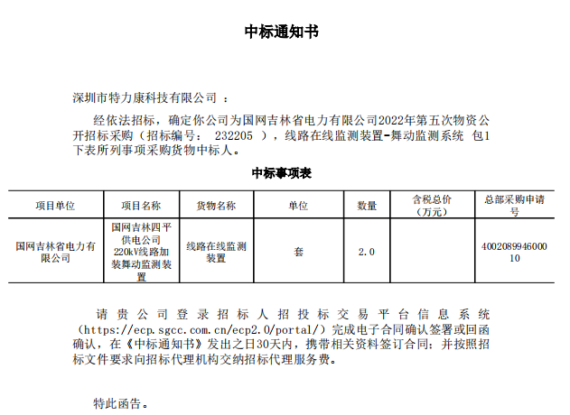 特力康中標國網黑龍江送變電工程公司的2024年度第18次物資類競爭性談判采購項目——慶陽驅鳥器物資框 特力康中標國網甘肅省電力公司省管產業單位2024年第五次物資競爭性談判授權采購項目 中標喜訊:深圳市特力康科技有限公司成功入圍許繼集團綜合能源公司輸電線路視頻在線監測裝置模塊集采項目 中標喜訊:特力康成功中標國網重慶市電力公司渝中一片區項目 特力康成功中標國網天津市電力公司2024年第二次?物?資招標項目 特力康中標國網安徽省電力有限公司蕪湖供電公司2024年3月非物質采購項目 貴州電力裝特力康電網架空線路覆冰監測系統,精準防冰保電網過冬? 百套落地山西電網!特力康輕量化輸電架空線路監拍裝置,筑牢輸電安全網 破解采空區隱患:山西電力裝特力康通用型監測裝置,守鐵塔穩運行 四川電力用特力康架空輸電線路山火監測裝置,筑牢林區輸電 “防火墻”? 遼寧電力啟用特力康多視角監拍裝置,全維度守護輸電安全? 破解黃土高原沉降難題:山西電力用特力康北斗裝置守桿塔安全? 山東電力啟用特力康動態版智能激光驅鳥器,動態防控守護變電站安全? 湖南超高壓電力啟用特力康球機 AI 監測裝置,智能守護輸電通道安全? 廣西電力啟用特力康高壓電纜護層環流監控設備,筑牢電纜安全防線? 寧夏配電線路安裝了我司防外破電子化智能警示牌