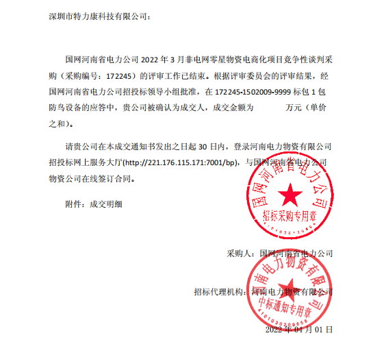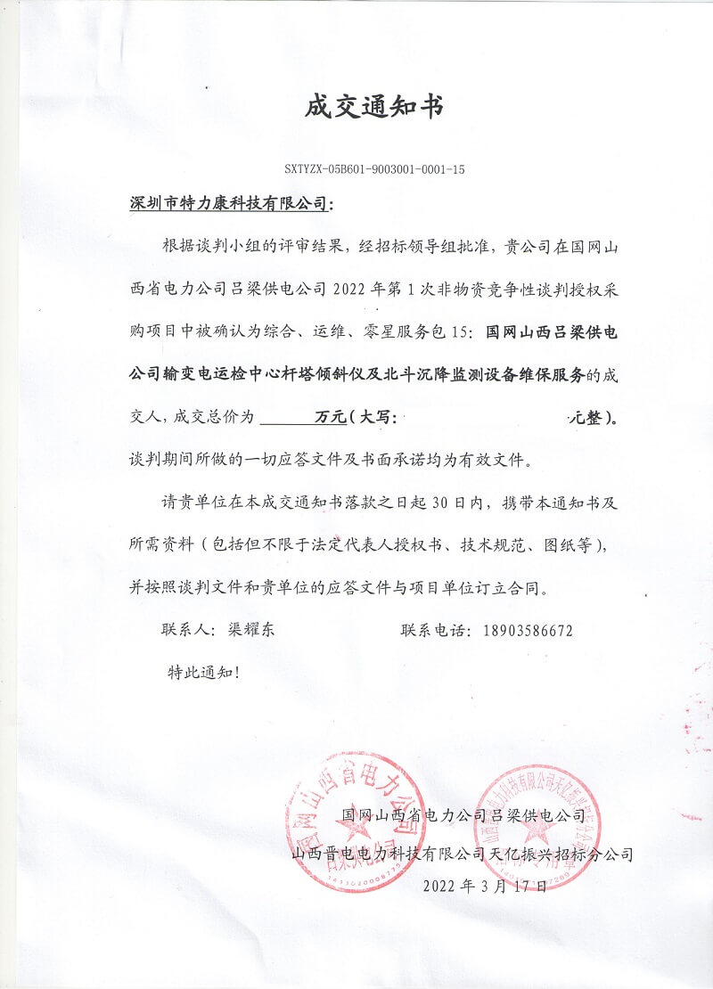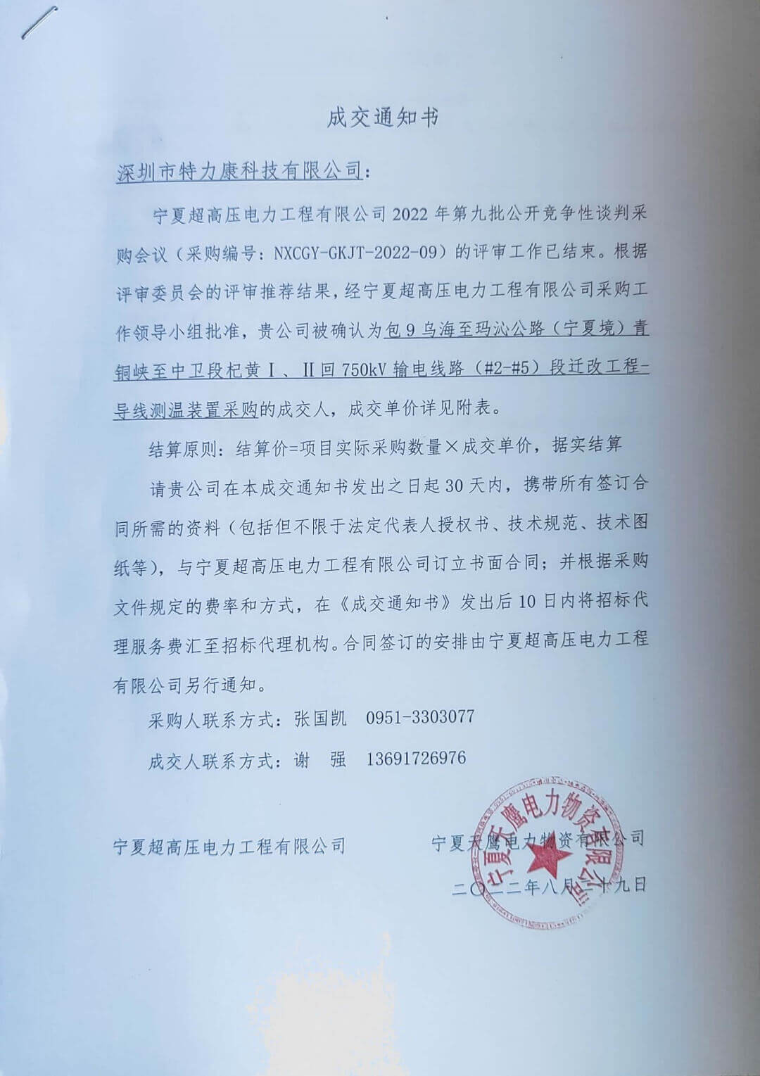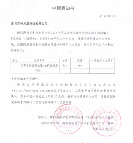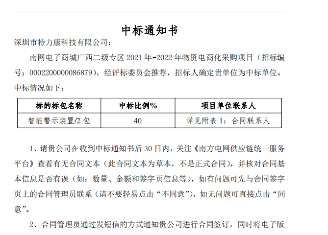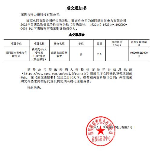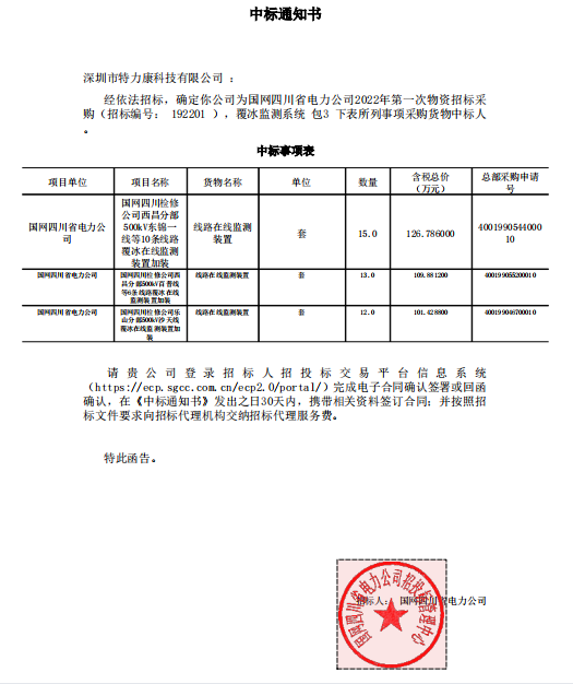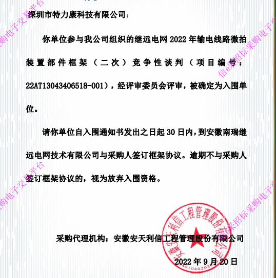 特力康中標國網黑龍江送變電工程公司的2024年度第18次物資類競爭性談判采購項目——慶陽驅鳥器物資框 特力康中標國網甘肅省電力公司省管產業單位2024年第五次物資競爭性談判授權采購項目 中標喜訊:深圳市特力康科技有限公司成功入圍許繼集團綜合能源公司輸電線路視頻在線監測裝置模塊集采項目 中標喜訊:特力康成功中標國網重慶市電力公司渝中一片區項目 特力康成功中標國網天津市電力公司2024年第二次?物?資招標項目 特力康中標國網安徽省電力有限公司蕪湖供電公司2024年3月非物質采購項目 貴州電力裝特力康電網架空線路覆冰監測系統,精準防冰保電網過冬? 百套落地山西電網!特力康輕量化輸電架空線路監拍裝置,筑牢輸電安全網 破解采空區隱患:山西電力裝特力康通用型監測裝置,守鐵塔穩運行 四川電力用特力康架空輸電線路山火監測裝置,筑牢林區輸電 “防火墻”? 遼寧電力啟用特力康多視角監拍裝置,全維度守護輸電安全? 破解黃土高原沉降難題:山西電力用特力康北斗裝置守桿塔安全? 山東電力啟用特力康動態版智能激光驅鳥器,動態防控守護變電站安全? 湖南超高壓電力啟用特力康球機 AI 監測裝置,智能守護輸電通道安全? 廣西電力啟用特力康高壓電纜護層環流監控設備,筑牢電纜安全防線? 寧夏配電線路安裝了我司防外破電子化智能警示牌