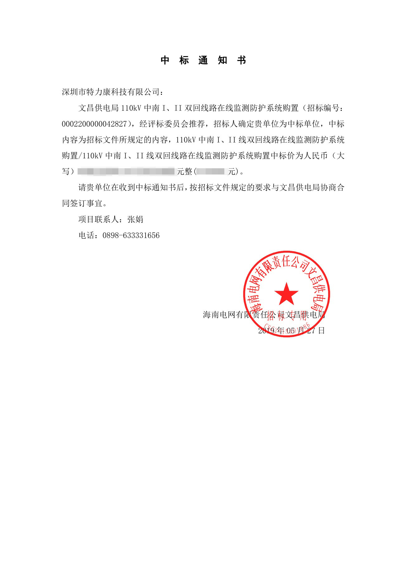 經評標委員會推薦,文昌招標單位,確定我司(深圳市特力康科技有限公司)為文昌供電局雙回線在線監測防護系統項目中標單位,現將中標公告公示。