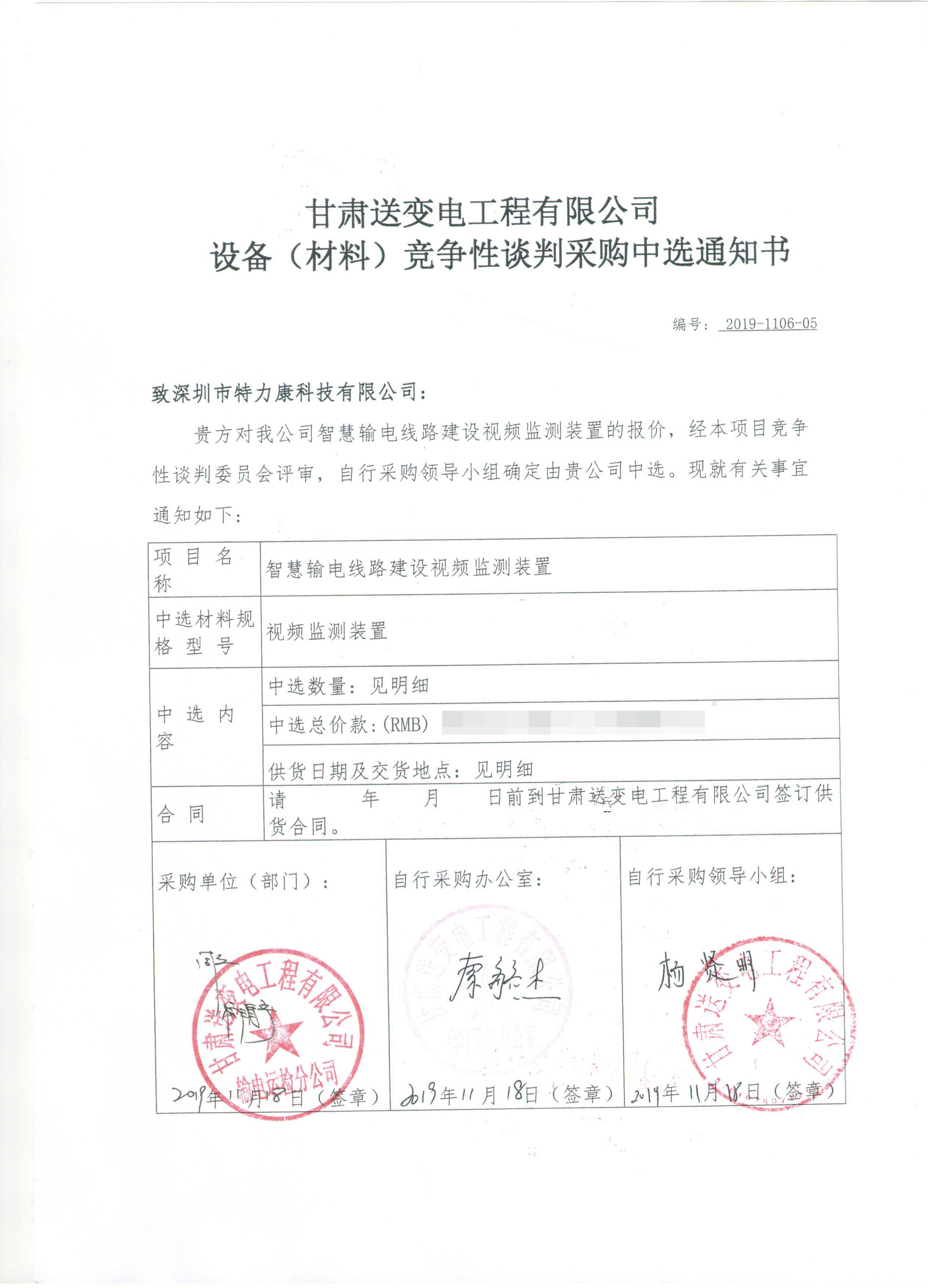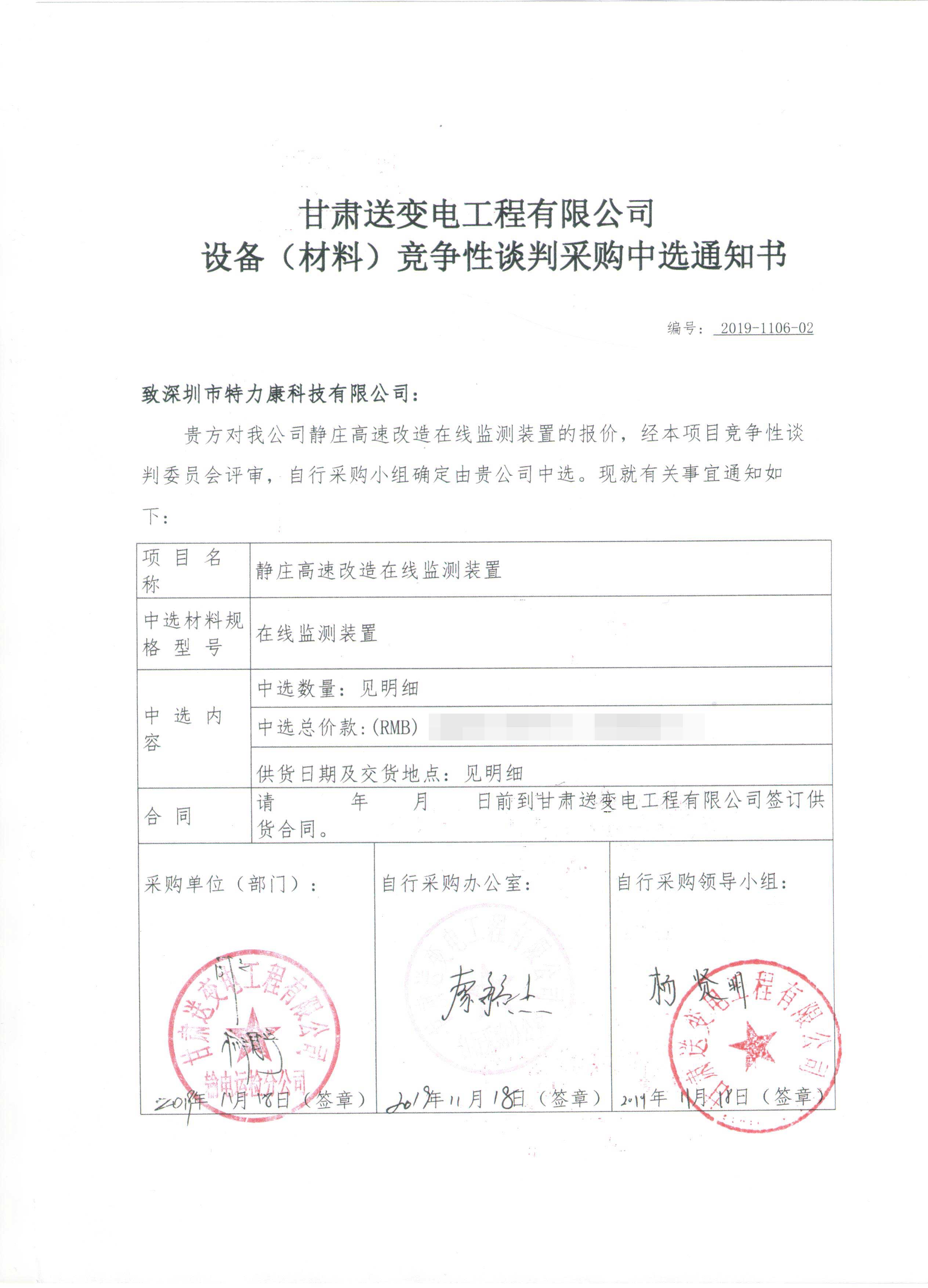 甘肅送變電工程有限公司智慧輸電線路建設視頻監測裝置及靜莊高速改造在線監測裝置競爭性談判采購工作已經結束,根據評審委員會評審結果,招投標領導小組批準,確定此次甘肅送變電工程有限公司智慧輸電線路建設視頻監測裝置及靜莊高速改造在線監測裝置競爭性談判采購由我司深圳市特力康科技有限公司中標,現將公告示下: