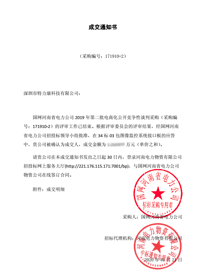 國網河南省電力公司2019年第二批電商化公開競爭性談判采購(采購編號: 171910-2) 談判工作已結束,經評審委員會評審,并報公司招投標工作領導小組批準,我司中標國網河南省電力公司2019年第二批電商化公開競爭性談判采購33標05包圖像監控系統配件及34標03包圖像監控系統接口板,中標通知如下: