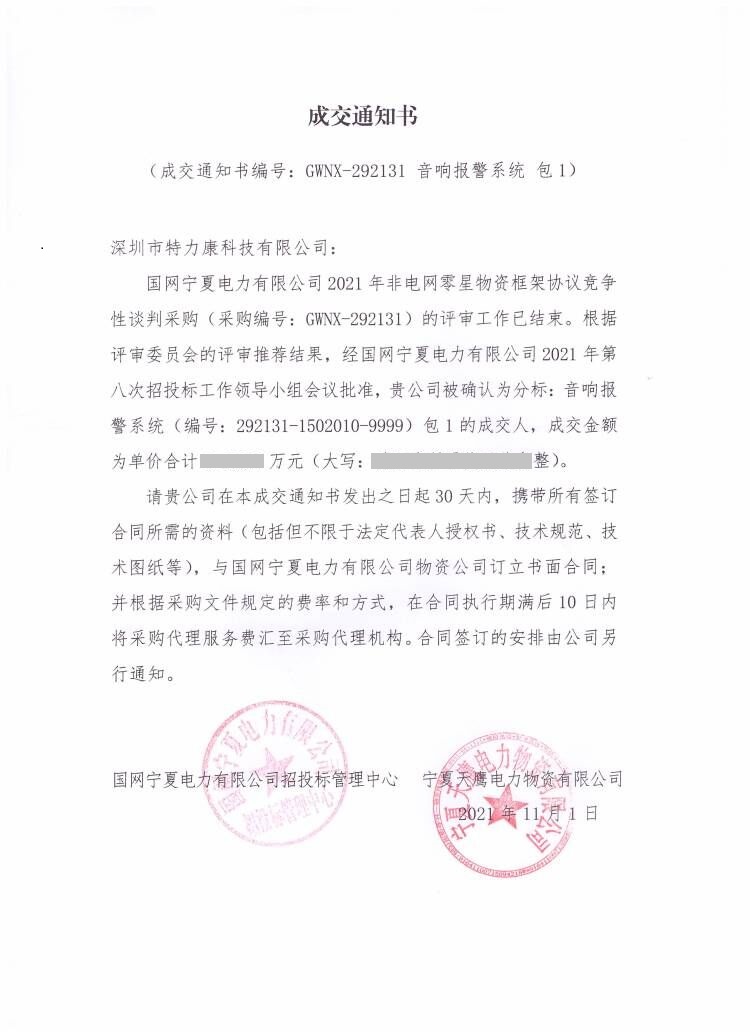 國網寧夏電力有限公司2021年非電網零星物資框架協議競爭性談判采購(采購編號: GWNX- 292131)的評審工作已結束。根據評審委員會的評審推薦結果,經國網寧夏電力有限公司2021年第八次招投標工作領導小組會議批準,我司被確認為分標:音響報警系統(編號: 292131-1502010-9999)包1的成交人,成交通知如下:
