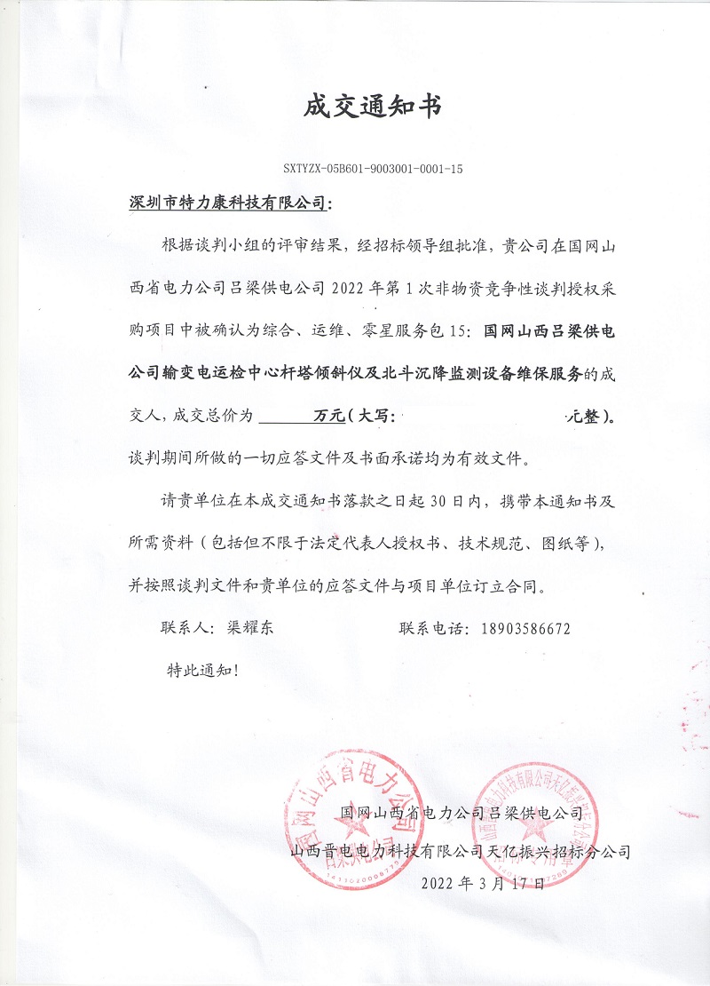 根據(jù)談判小組的評審結果,經招標領導組批準,我司在國網山西省電力公司呂梁供電公司2022年第1次非物資競爭性談判授權采購項目中被確認為綜合、運維、零星服務包15:國網山西呂梁供電公司輸變電運檢中心桿塔傾斜儀及北斗沉降監(jiān)測設備維保服務的成交人,成交通知如下: