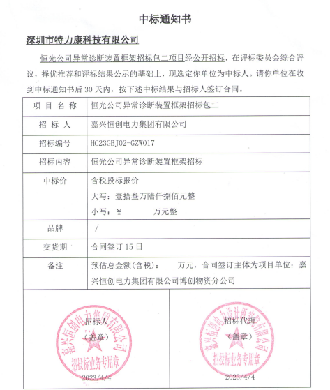 恒光公司異常診斷裝置框架招標(biāo)包二項(xiàng)目經(jīng)公開(kāi)招標(biāo),在評(píng)標(biāo)委員會(huì)綜合評(píng)議,擇優(yōu)推薦和評(píng)標(biāo)結(jié)果公示的基礎(chǔ)上,現(xiàn)選定我司為中標(biāo)人,中標(biāo)通知如下: